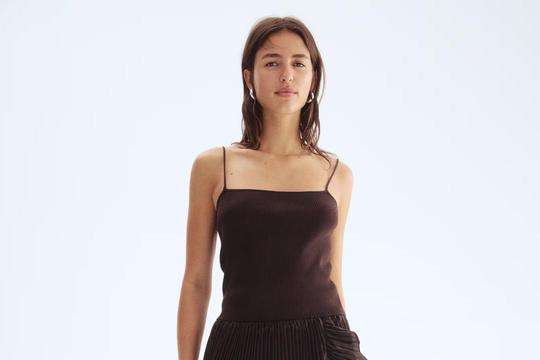 U pitanju je plisirana suknja u tamno smeđoj boji duljine do gležnjeva koju jako zanimljivom čine volani. Volani su također plisirani te se nalaze na donjem porubu i dijagonalno dužinom cijele suknje zbog čega djeluje kao da ova suknja ima veliki preklop. Ovu H&M plisiranu suknju zamislili smo u kombinaciji s pripijenom majicom dugih rukava u nekoj tamnoj boji ili sa sasvim jednostavnom satenskom bluzom te visokim čizmama na petu.