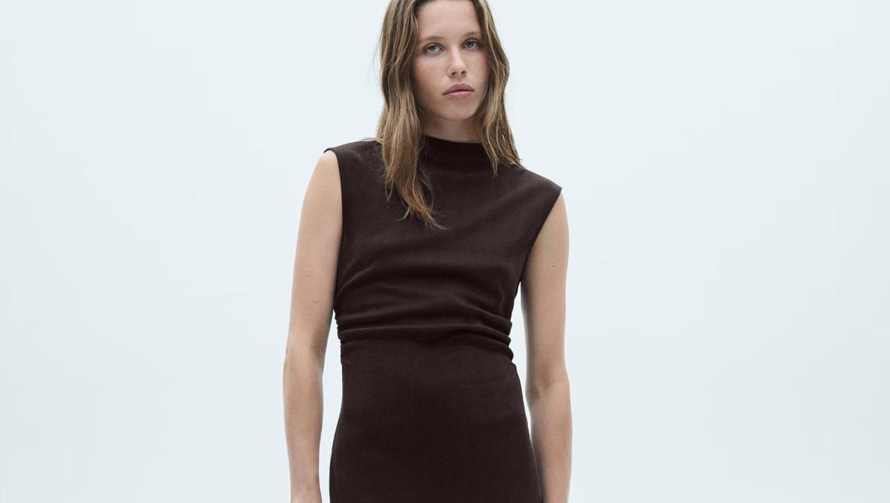 Riječ je o blago pripijenoj haljini od tankog pletiva koja seže do polovice listova i u tamno smeđoj boji. Blago povišena kragna te nabrani dio na struku, ovoj haljini daju zanimljivu dimenziju, a zbog toga što nema rukave ju možemo nositi već sada, u kasno ljeto. Uz nju ćemo kombinirati cipele s kitten potpeticom ili pak tenisice s platformom kako bismo dodatno izdužili figuru.