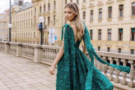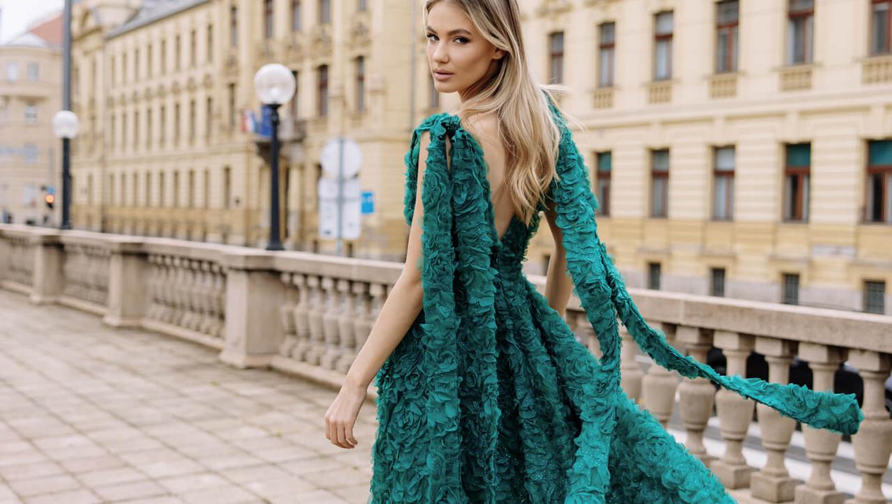 Jedan od modela koji nam je doslovno oduzeo dah je Dina, duga, raskošna haljina u najnježnijoj nijansi puderasto ružičaste, prekrivena trodimenzionalnim cvjetovima ruža, a koja ovoga puta dolazi u divnoj smaragdno zelenoj nijansi. Haljina ima pomalo retro siluetu, ali u najmodernijem smislu te riječi – s puno pokreta, fluidnosti i nježnosti u svakom koraku, a dugi til u nijansi haljine, koji s ramena pada poput lepršavog plašta, dodaje joj notu eteričnosti i dramatičnosti. Ovo je haljina kao stvorena za sve one romantičarke koje pažljivo čuvaju pisma, vjeruju u sudbinu i znaju da u životu postoje oni trenuci koje vrijedi čekati.