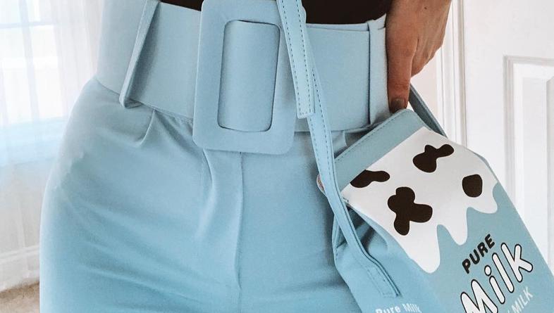 Riječ je o torbici koja nalikuje tetrapaku mlijeka. Svijetloplave je boje, a na sebi ima i natpis ''Čisto mlijeko'' te militražu i sastav. Nosi se preko ramena i izrađena je od prave kože, a naručiti se može na webshopu New Chic.