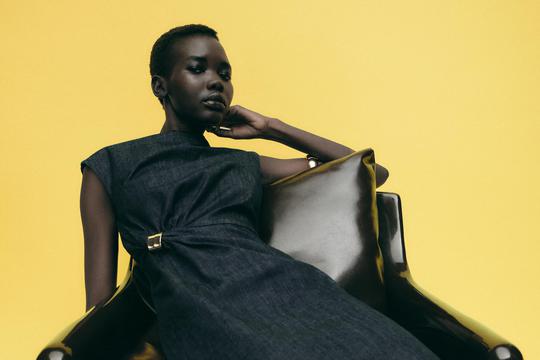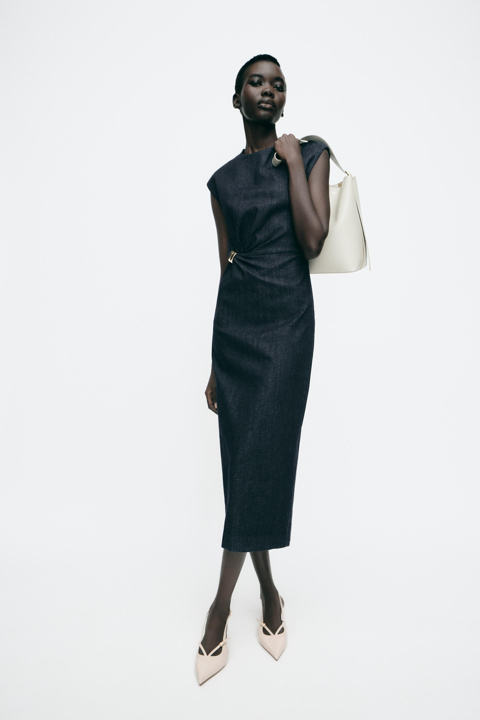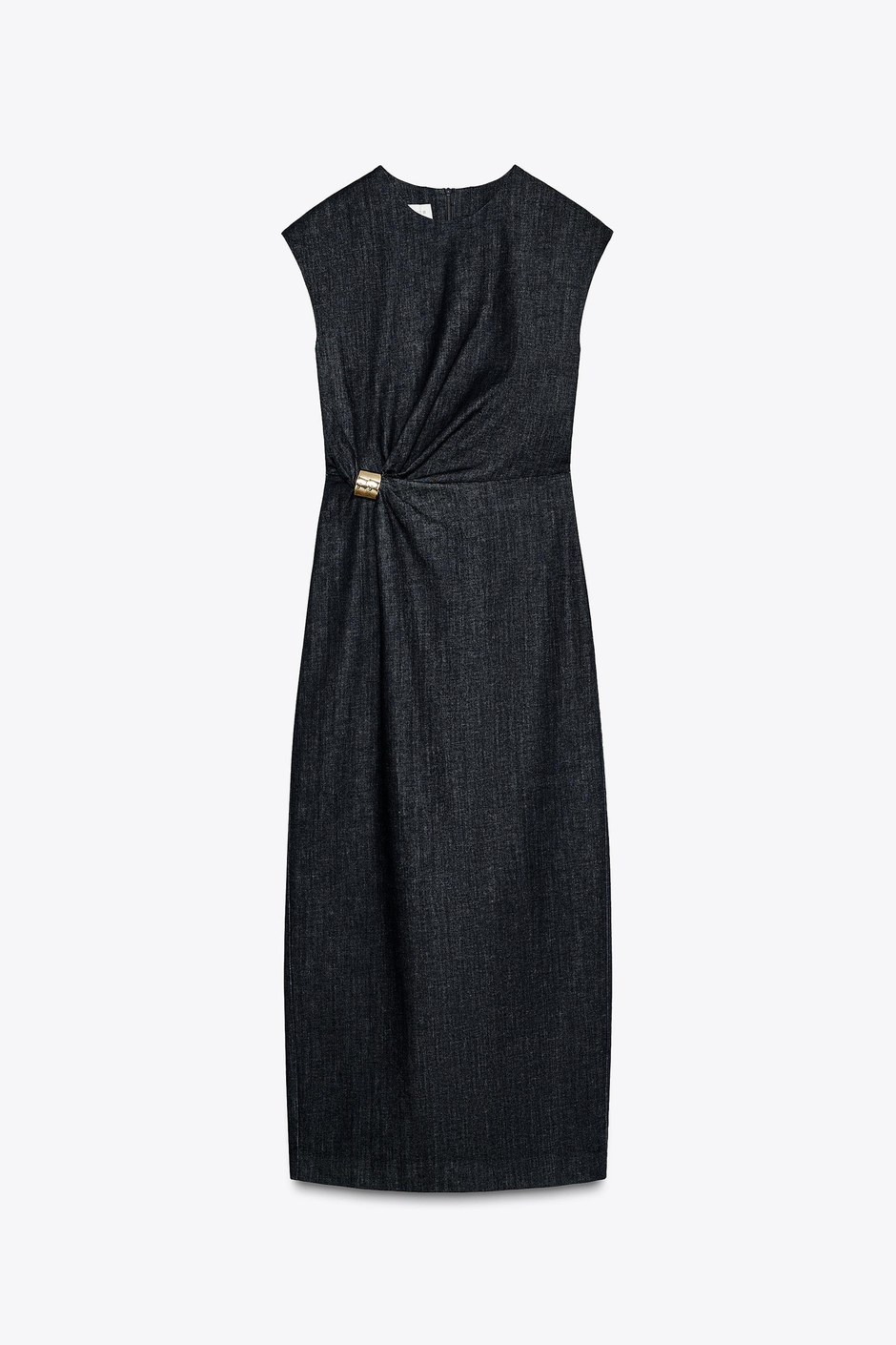 U pitanju je uska haljina bez rukava koja seže do polovice listova, a na viralni komplet nas je podsjetila jer je napravljena od identičnog trapera, od boje do teksture. Dimenziju i zanimljiv izgled ovoj haljini daje nabrani struk te metalna kopča koja je, na jednoj strani struka, pričvrščena za te nabore. Ne smijemo zanemariti niti jastučiće na ramenima koji daju dozu dramatičnosti, a koji će ovog proljeća postati jako popularan dodatak na mnogim komadima.