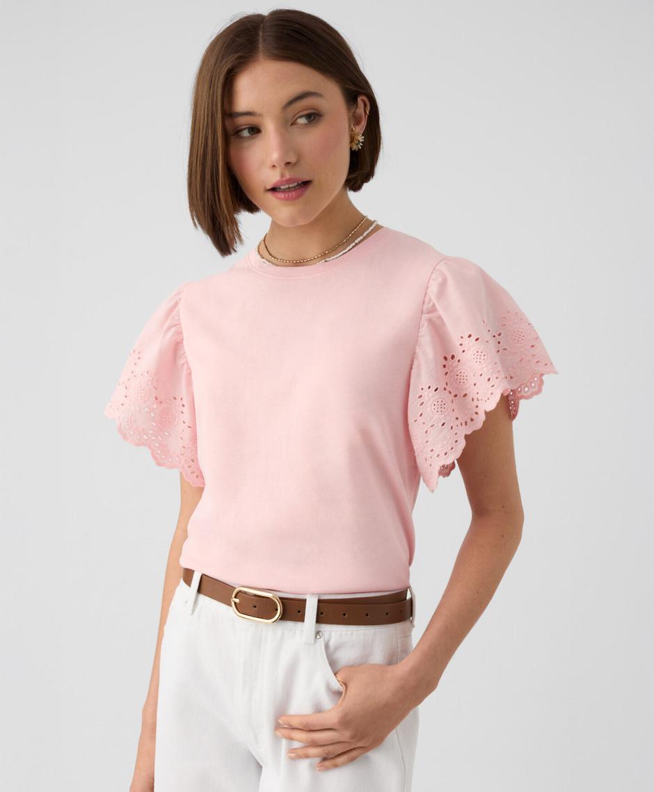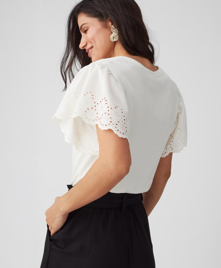 Majica je napravljena od 100% pamuka, što znači da ćeš se u njoj osjećati udobno i svježe tijekom cijelog dana. Kroj je jednostavan i klasičan, što je čini savršenom bazom za različite outfite, dok rukavi ukrašeni čipkastim detaljima donose onaj "wow" efekt. Voluminozni su, valoviti i s delikatnim floralnim vezom — baš pravi romantični dodatak koji majici daje poseban karakter.