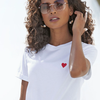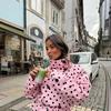 Monokromatska logika nastavlja se kroz svijetle salonke i torbicu u istom tonalitetu, za kohezivan i uredan dojam. Dodatni sloj interpretacije dolazi kroz točkastu crno-bijelu estetiku. Ženstveni uzorak točkica, koji se ove sezone vratio, ovdje funkcionira kao diskretan kontrapunkt čistim linijama outfita. Time se sugerira praćenje trendova, ali bez njihovog dominantnog nametanja.