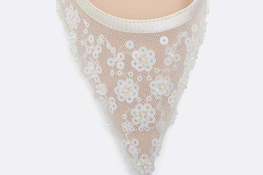 U pitanju su slingback salonke u špic čije je gornjište napravljeno od bijelog mrežastog materijala kroz koji su, u obliku cvjetića, našivene bijele šljokice. Ovdje je i tanki kožni obrub te remenčić za podežavanje veličine s metalnom kopčom. Potpetica je niska, 6 centimetara, ali i ipak dovoljna da lijepo izduži nogu te ima oblik pješčanog sata što osigurava udobnost i mogućnost da u cipelama izdržimo satima i plešemo cijelu noć.