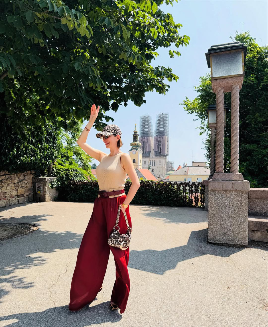 Najveću pažnju u ovom outfitu plijene lepršave, široke hlače u zagasito crvenoj boji koje je Bojana iskombinirala s neutralnim i potpuno jednostavnim topom bez rukava u bež boji. Iako ova kombinacija, zbog boje hlača, nije niti malo dosadna, sve je začinila dodacima s leopard uzorkom koji je već drugu godinu zaredom velika zvijezda i često je dio mnogih svakodnevnih outfita.