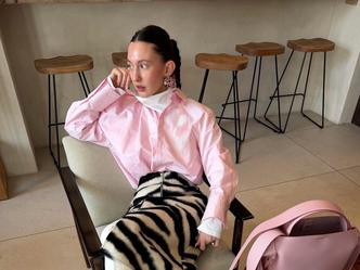 U ovoj odjevnoj kombinaciji, Mirjana je prvenstveno kombinirala različite teksture - satensku suknju srednje dužine i lepršavu lanenu košulju koju je u struku zavezala u čvor. S obzirom na to da su i suknja i košulja u sivim tonovima, malo je boje ubacila pastelno zelenim Gianvito Rossi natikačama na petu, a još malo profinjenosti je dodala visećim naušnicama u obliku suze te zlatnim satom i prstenom. Na ovu kombinaciju nemamo baš niti jednu zamjerku!