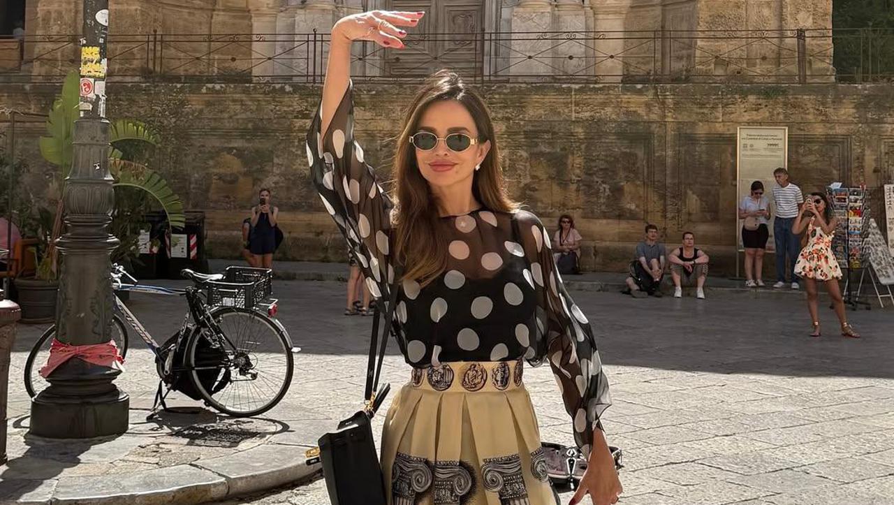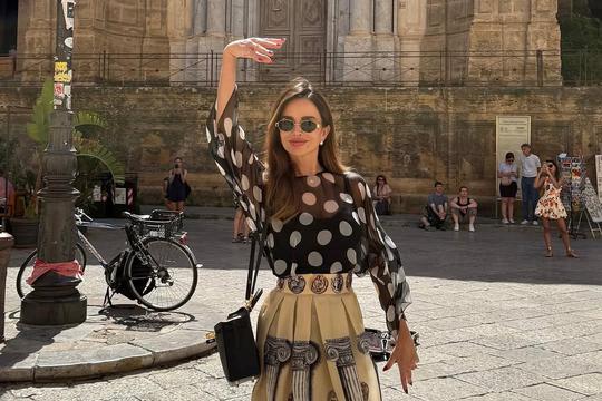 U ovoj odjevnoj kombinaciji, Severina se nije libila miješati uzorke i svaki komad učiniti jednako važnim i upečatljivim. Jako efektnu Dolce&Gabbana midi suknju (iz kolekcije za proljeće 2014. godine) s motivima grčkih novčića i arhitekture upotpunila je crnom prozirnom bluzom s velikim bijelim točkama dugih rukava. S obzirom na to da je na Siciliji pravo pravcato ljeto, na nogama ima japanke i to Gucci model, a nosi i nezaobilazne sunčane naočale. Tu se našla i crna torbica u Hermès Kelly modelu.