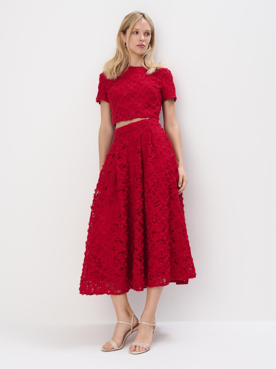 - Krasnu suknju midi dužine koja je u potpunosti načinjena od romantične čipke u efektnoj boji, pronašli smo u Mohitu
