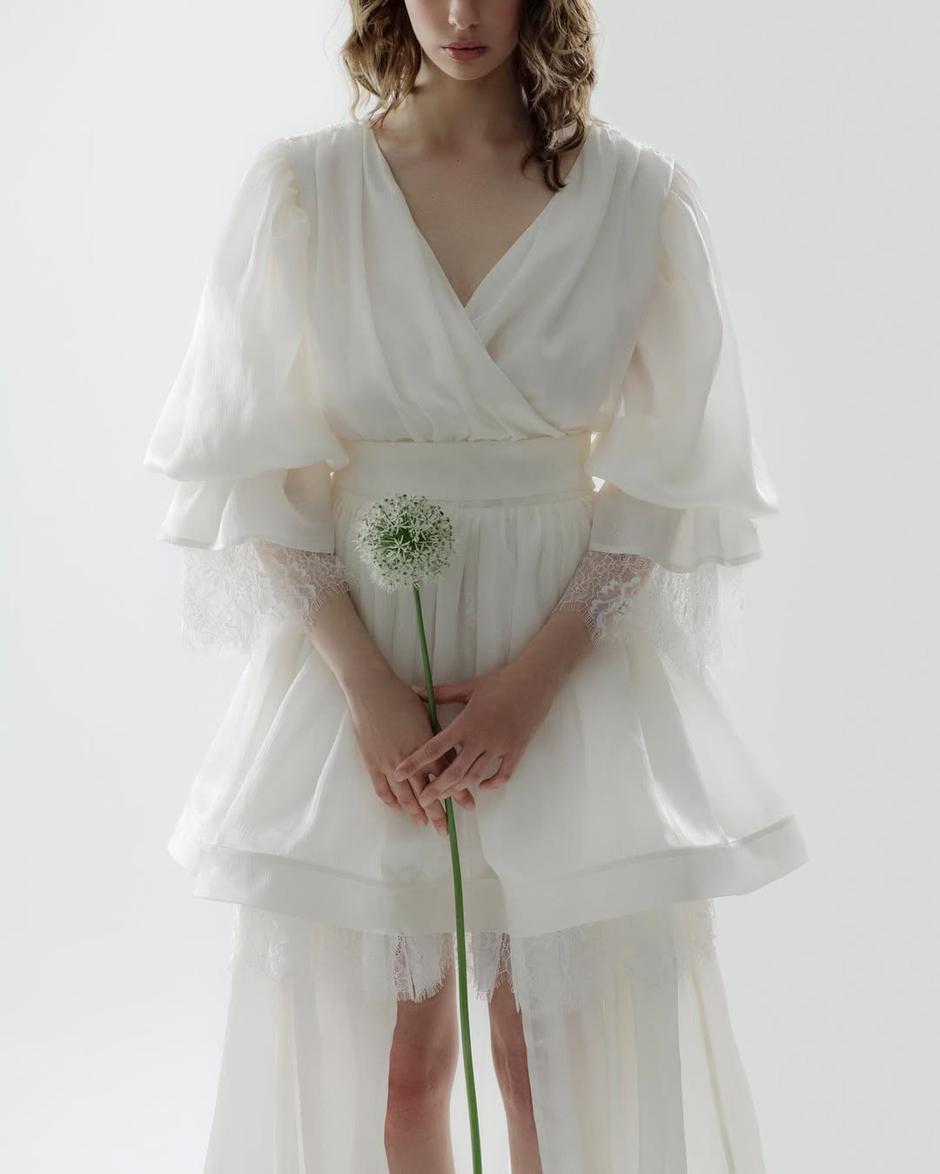 Prva vjenčanica kojoj je posvećena objava na Instagramu, osvojila nas je istog trena. U pitanju je svilena vjenčanica sa suptilnim detaljima od čipke i nije nalik na tipične vjenčanice kakve smo dosad imali prilike vidjeti, ali je ipak jako romantična. Ima duge, balon rukave s volanima na rubovima, struk joj je istaknut širokim, ušivenim pojasom, a donji dio joj je asimetričan - kombinira kratki dio nalik na voluminoznu, zvonoliku suknju te odvojivi, prozirni dugi dio koji je s prednje strane otvoren i ističe noge. Upravo taj kontrast između kratkog i dugog, stvara posebnu dinamiku na vjenčanici i čini ju baš neobičnom i kao stvorenom za svaku mladenku koja se želi istaknuti.