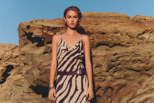 One koji preferiraju haljine, zasigurno će oduševiti pravi ljetni klasik s dozom modne poezije – haljina s tankim naramenicama s istim zebra uzorkom u toplim tonovima. Ovaj model midi dužine ima elegantan, ali nenametljiv kroj koji grli tijelo, a s tankim naramenicama i blago spuštenim dekolteom odiše suptilnom senzualnošću. Stilizirana s remenom u struku i minimalističkim sandalama, ova haljina čini ležeran i istovremeno profinjen ljetni look, kao stvoren za sve one trenutke kada nam treba nešto lagano, a opet efektno.