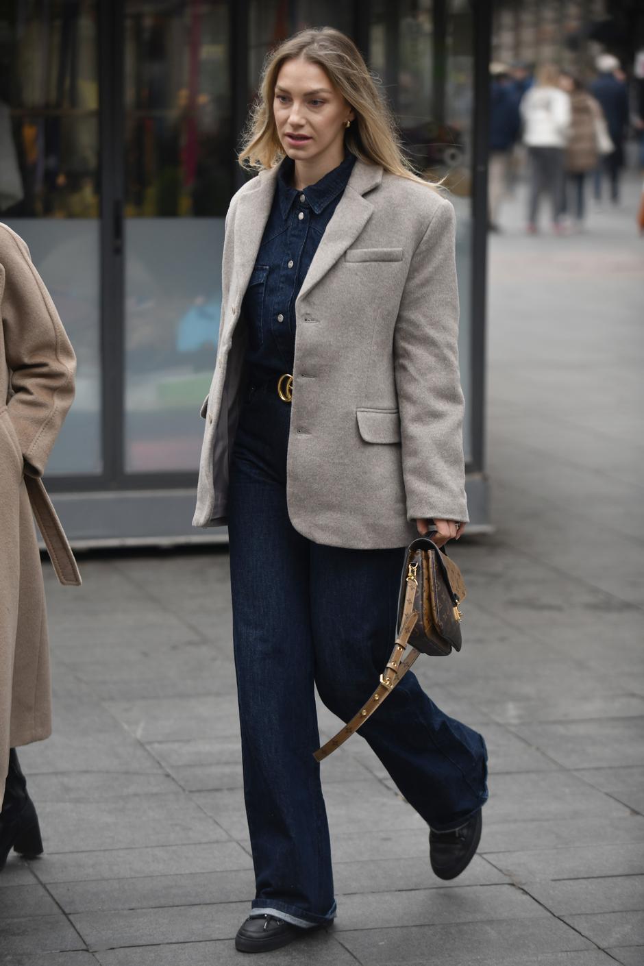Naime, u glavnoj je ulozi ovdje zasjao kombinezon od tamnog trapera, vješto uklopljen među ostale komade. Strukirani kombinezon diskretno je naglašen elegantnim crnim Gucci remenom sa zlatnom kopčom, a mlada je dama preko njega odjenula klasični oversized vuneni sako u nježnoj sivo-smeđoj nijansi koji je savršeno izbalansirao ležernost trapera, začinivši ovu kombinaciju prstohvatom profinjenosti.