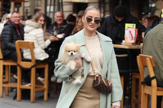 Dodaci su svedeni na minimum, ali itekako primjetni: mala Louis Vuitton torbica i sunčane naočale unose dozu urbanog glamura, dok cijeli look dobiva dodatni šarm zahvaljujući malenom psiću u naručju, koji cijeloj priči daje onu toplu, životnu notu. Ovo je styling koji dokazuje da se i usred zime možemo igrati bojama, birati nježnije tonove i reći 'zbogom' tamnim, teškim kombinacijama - barem na trenutak. Jer moda, baš kao i raspoloženje, ponekad traži malo svjetla da bi zablistala.