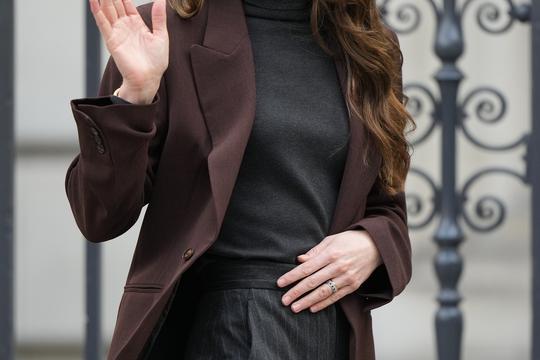 Naime, Kate je za posjet Nacionalnoj galeriji portreta odabrala kombinaciju u tamnim, zagasitim bojama - tamnosivu, gotovo crnu, dolčevitu koju je upotpunila tamnosmeđim, blago strukiranim sakoom te široke tamnosive hlače s uzorkom bijelih prugica, popularno zvanim 'pinstripe', a koje su nas posebno zaintrigirale.