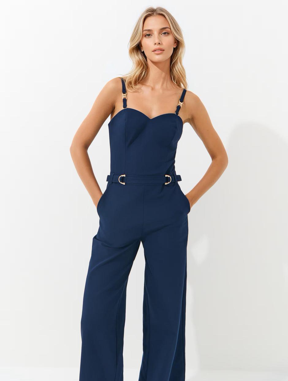 Ovaj model kombinira sve što volimo u ljetnoj odjeći: uske, podesive naramenice koje laskaju ramenima i dekolteu, srcoliki izrez koji naglašava ženstvenu siluetu, i ravne, široke nogavice koje vizualno izdužuju figuru i daju osjećaj lakoće. Pojas s decentnim metalnim kopčama dodatno ističe struk i unosi dozu sofisticiranosti. Materijal s 50% pamuka čini ga prozračnim i ugodnim za cjelodnevno nošenje, čak i kad temperature prijeđu trideset.