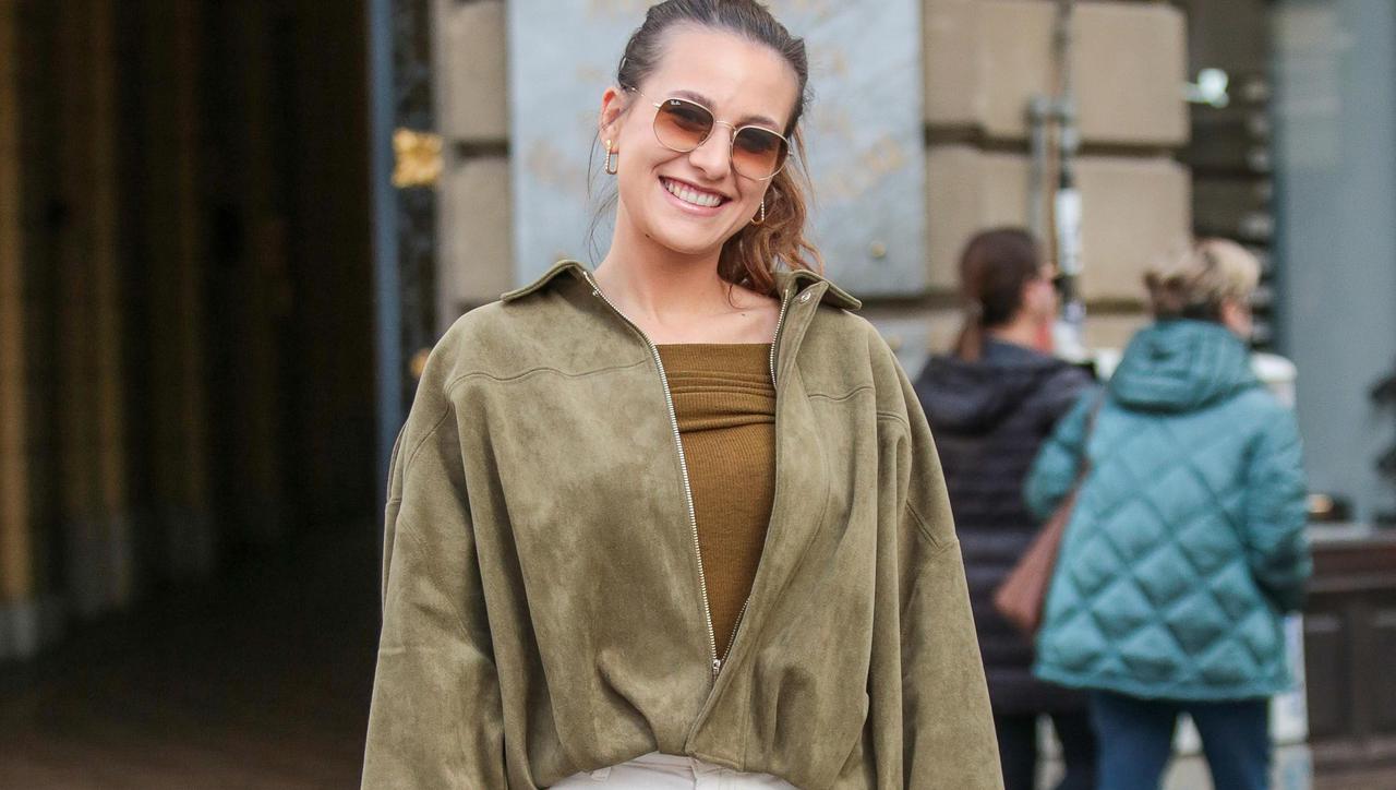 Gornji dio outfita čini široka, brušena jakna u maslinasto-smeđoj nijansi, komad koji se savršeno slaže s topom u toploj boji karamele. Ova kombinacija tonova ostavlja dojam topline, ali i lakoće, a kontrast koji podiže cijeli look čine hlače visokog struka u svježoj krem boji. Njihov kroj, lagano naboran iznad čizama, unosi opuštenost i trendovski 'nonchalant' dojam, dok istovremeno stvara savršen okvir za ključni modni adut - visoke smeđe čizme od brušene kože.