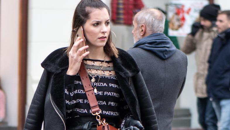 I u ovom slučaju suknja je komad oko kojeg se sve vrti. Vrlo zanimljiv komad sastoji se od mnogo slojeva napravljenih od nepravilno rezanih i različitih komada - efektno! I ova je djevojka uz suknju kombinirala gležnjače i crnu kožnu jaknu, ali ovaj puta topliju, podstavljenu krznom. Majica Patrizia Pepe je upadljiva, s isprintanim logom i metalnim ringovima, a sve zajedno super izgleda. Potpuno crnu kombinaciju ove prolaznice na Cvjetnom trgu "razbija" smeđa poluokrugla torbicapreko tijela - inače jedan od hit modela torbica ove godine. Ako si primjetila, torbicu istog oblika nosi i Zadranka na prethodnoj slici.
