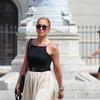 Donji dio čine široke, lepršave hlače visokog struka koje vizualno izdužuju noge i odišu sofisticiranošću, a ispod sakoa proviruje jednostavna bijela majica koja cijelom izdanju daje opušten balans. Modni su dodaci također pomno odabrani kako bi nadogradili look - elegantna crna torbica s tankim zlatnim remenom i crne sandale s visokom petom, sunčane naočale s bold okvirima i raspušteni valovi u kosi zaokružili su styling dostojan prave modne dive.