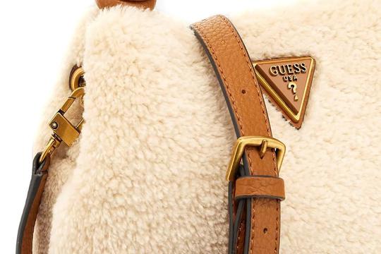 U pitanju je Guess torbica, model Shaida sašivena od mekanog teddy materijala u boji slonovače. Nježni materijal upotpunjen je kožnom isprepletenom ručkom u boji konjaka, a u istoj boji je i prepoznatljiv Guess logo u obliku trokuta na prednjoj strani torbice.