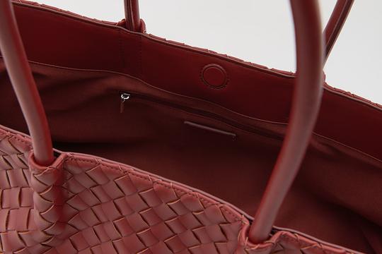 Torba je bordo boje, izrađena od širokih pletenih kožnih traka, s naglašenom širinom i većim volumenom. Dimenzijama je prostrana i praktična, što je čini idealnim izborom za svakodnevnu gradsku torbu koja može pratiti ritam dana, od poslovnih obaveza do popodnevnih šetnji.