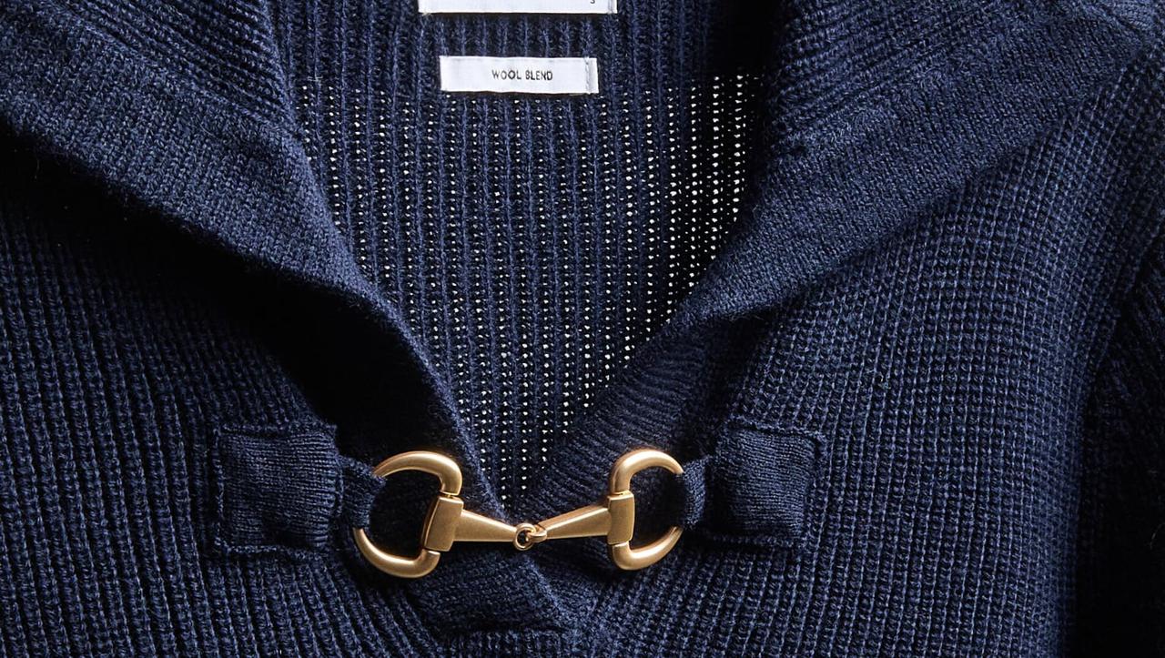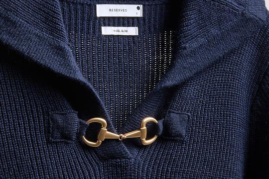 U pitanju je tanki tamno plavi džemper rebraste teksture kojeg zanimljivim čini velika kragna koja seže sve do ramena te mali V izrez preko kojeg se nalazi metalna kopča u zlatnoj boji. Upravo taj detalj je ono zbog čega ovaj džemper, osim svog zanimljivog kroja, djeluje skupocjeno i podsjeća na dizajnerski. Naime, ta je kopča gotovo pa identična Horsebit motivu koji je zaštitni znak modne kuće Gucci.