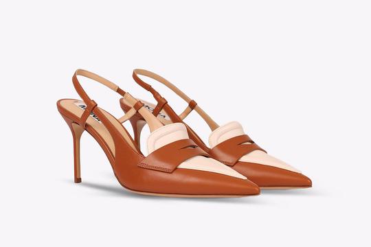 U pitanju su cipele koje su svojim oblikom zapravo klasične i već puno puta viđene slingback salonke u špic no, na svom gornjištu imaju jezik i poprečnu traku s prorezom koji je karakterističan za mokasinke. Također, konjak smeđa boja na rubovima i preklopu te bež boja na gornjištu, stavljaju naglasak na šavove što smo naviknuli viđati na loafericama.