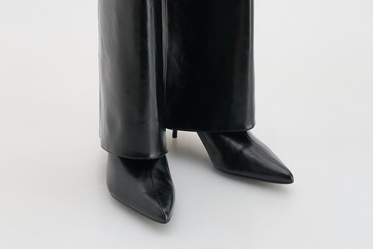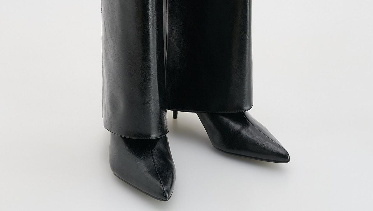 U pitanju su čizme na visoku tanku petu koje imaju špičasti vrh, sežu otprilike do koljena i koje uočljivima i pomalo neobičnima čini njihov preklop koji nas asocira na vrlo dugu nogavicu hlača spuštenu do rista. Vidimo, megapopularne Givenchy Shark Lock čizme za ovaj su model bila velika inspiracija... Pri vrhu sare još možemo vidjeti i dva fiksirana remenčića s okruglim zlatnim kopčama koje malo podižu crnu boju ovih čizama.