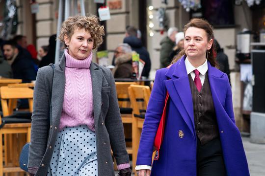 Druga prijateljica donosi sasvim drukčiju, ali jednako promišljenu modnu priču. Puderasto ružičasta dolčevita omekšava cijeli look i unosi romantičnu notu, a simpatična točkasta minica u boji vedrog neba djeluje gotovo djevojački, s dozom razigrane nostalgije za šezdesetima. Sivi kaput funkcionira kao neutralni stabilizator koji smiruje pastelnu paletu i daje kompoziciji ozbiljniji okvir, a visoke marte i guste, metalik tajce brutalno presijecaju tu nježnost i uvode element urbanog bunta.