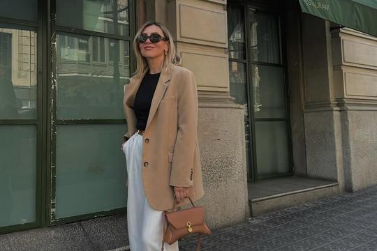 Satenske hlače + bijela majica + oversized sako + mrežaste balerinke
