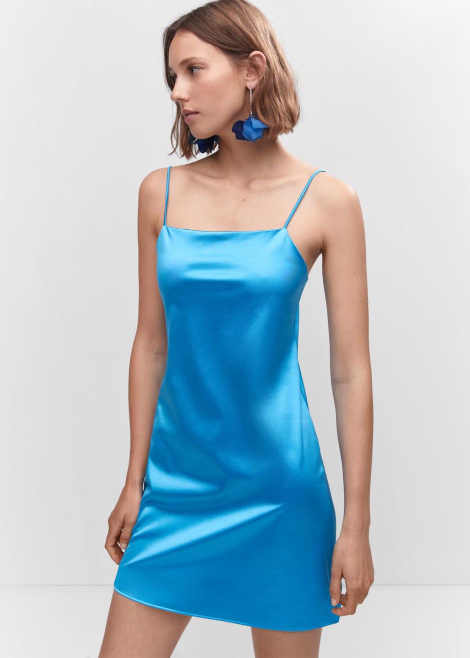 Ova haljina s bretelicama napravljena je od satena i dolazi u mini verziji što ju čini idealnom za ljeto. S obzirom na to da je skroz jednostavna, ali i efektna zbog svoje boje, odlično će se slagati s raznim vrstama cipela kao što su ravne sandale i sandale na visoku petu s tankim remenčićima, ali i balerinke te natikače tipa Hèrmes Oran.