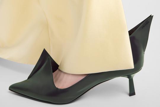 Njihov arhitektonski dizajn s oštrim linijama i skulpturalnim trodimenzionalnim detaljima podsjeća na male umjetničke instalacije, a bogata, sjajna koža dodatno naglašava dramatičan špic. Sve to u kombinaciji s lakiranim potpeticama srednje visine (55 mm) čini ih savršenim spojem elegancije i odvažnosti. Prada salonke dolaze u zelenoj, ljubičastoj i crnoj boji, a s obzirom da je riječ o cipelama s potpisom, cijena im je nešto više i iznosi 1150 eura.