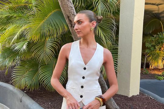 Ovaj profinjeni duo, koji se sastoji od strukiranog prsluka i hlača širokih nogavica, s pravom je proglašen najtraženijim komadom iz nove kolekcije. Razlog njegove goleme popularnosti leži u savršenom balansu između oštrog, gotovo arhitektonskog krojačkog umijeća po kojem je brend poznat i opuštene elegancije idealne za toplije dane. Izrađen je od prozračne mješavine viskoze i lana, što ga čini iznimno ugodnim i laganim za nošenje, a upravo ovaj odabir materijala, koji je dio Karen Millen 'Greener' inicijative s fokusom na manji utjecaj na okoliš, osigurava da komadi predivno padaju, ali i da koža diše tijekom cjelodnevnog nošenja.