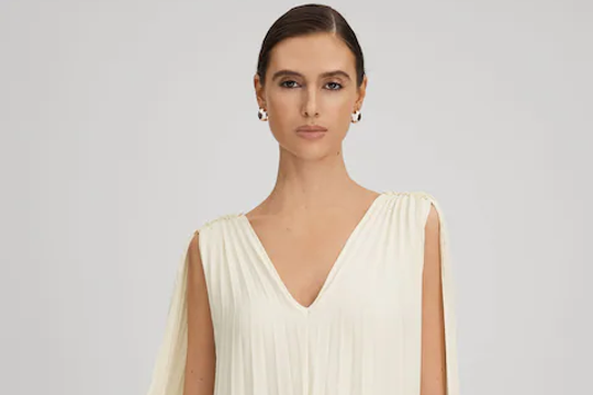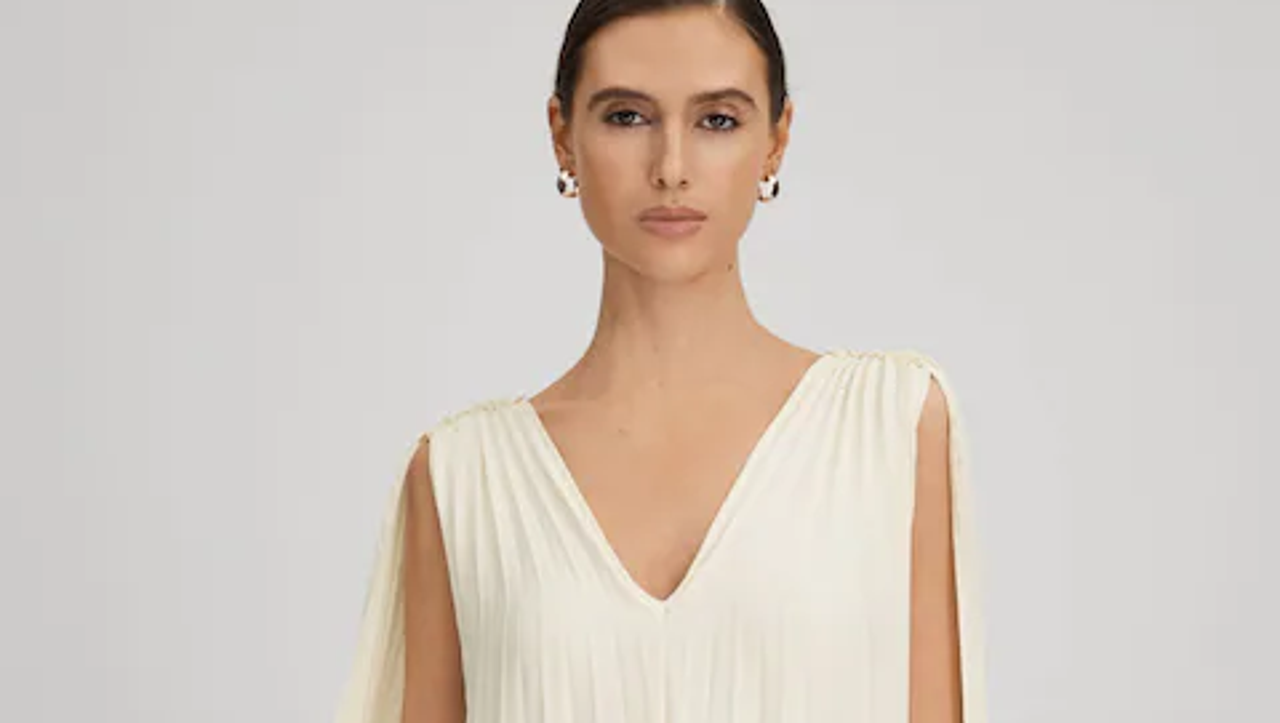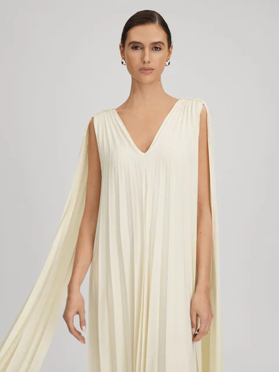 U pitanju je haljina brenda Reiss koja dolazi u midi dužini te je u potpunosti plisirana. Bez rukava je i s V izrezom, ali nije strukirana što joj daje jednu opušteniju notu i dozu lepršavosti. Ono zbog čega je profinjenija i dramatičnija od drugih haljina sličnog tipa i djeluje pomalo dramatično su dva tanka plašta koja su našivena na zadnjoj strani ramena, a koja sežu sve do ruba same haljine.