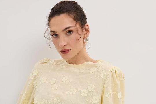 U pitanju je lagana, blago prozirna bluza jednostavnog, ravnog kroja sa suptilnim balon rukavima 3/4 dužine. Posebnom ju čine cvjetići s po pet okruglih latica koji izgledaju kao da rastu iz izvezenih grana koje se protežu cijelom površinom bluze. Iako se cvjetići i izvezene grane nalaze na cijeloj bluzi, nisu niti malo napadni jer su potpuno iste boje kao sama bluza - tamno smeđe te nježne, maslac žute za koju nam se čini da ćemo ju itekako voljeti i ovog proljeća.