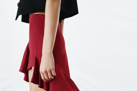 Duboka crvena boja pojačava dojam strasti i snage, ali zadržava sofisticiranost. Riječ je o nijansi koja funkcionira i u dnevnim i u večernjim kombinacijama, ovisno o stilskom kontekstu. Asimetrija ima posebno mjesto u svijetu kreiranja, odijevanja i općenito dizajna te se može tumačiti na razne načine, a jedan od svakako zanimljivijih je ukrašavanje volanima. Zanimljivo je vidjeti kako funkcioniraju kreacije ovako eksremne u razlici u dužini, gore je gotovo kao minica, dolje je maksi suknja.