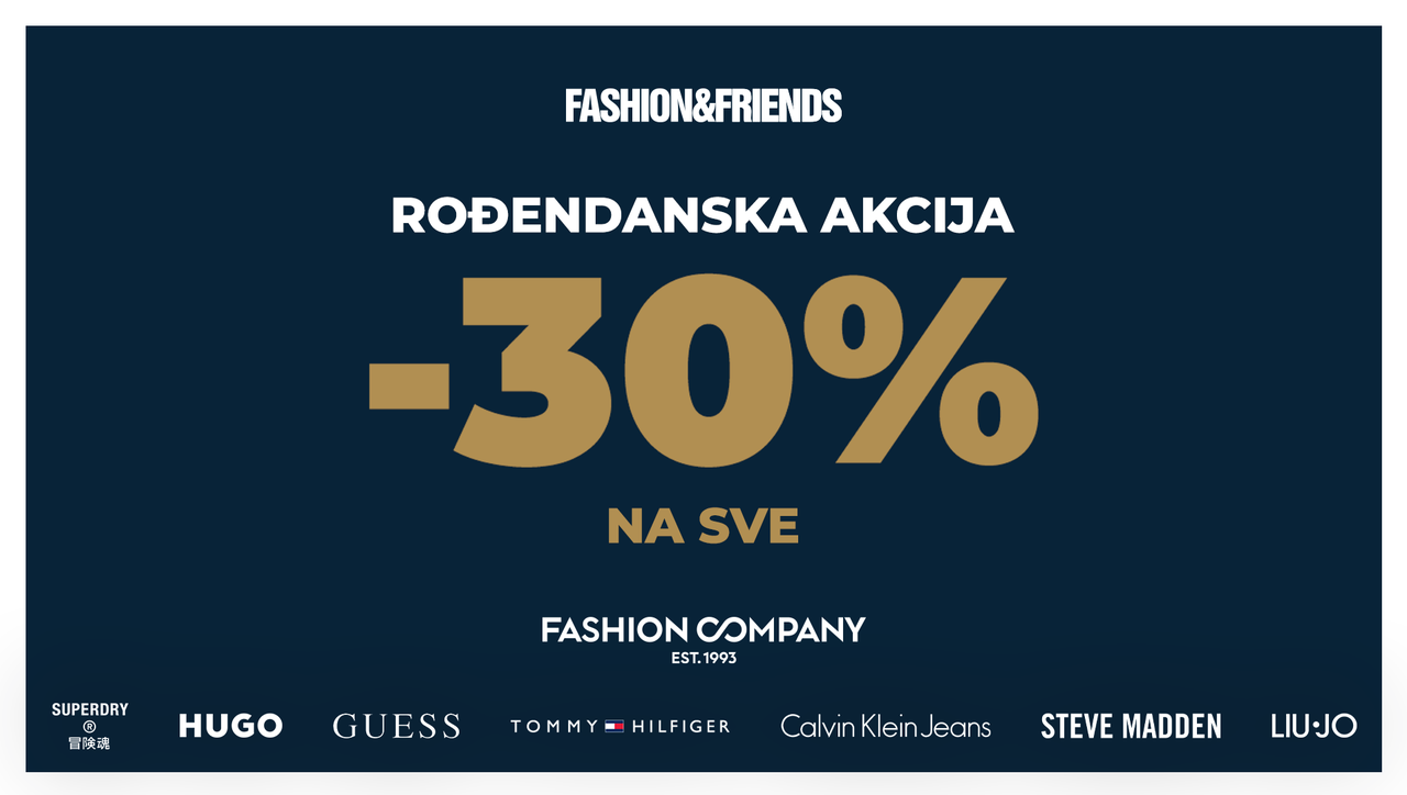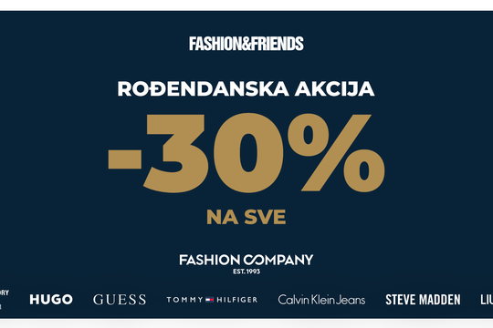 - Najtraženiji svjetski brendovi okupljeni pod konceptom Fashion&Friends i Fashion Company ove godine slave u velikom stilu – uz rođendanski popust od 30% na cijeli asortiman, i to samo jedan dan – u petak, 16. svibnja!