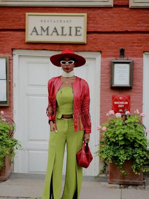 OK, ova bi modna kombinacija bila dobra i s nekim "običnim" crnim hlačama, ali prorez sprijeda na nogavicama je dobar primjer kako jedan mali detalj može napraviti razliku. Prorez na neobičnom mjestu učinit će da sasvim klasične hlače odjednom nisu više "dosadne" i možemo ga zamisliti kako mijenja dojam i neke svakodnevnije kombinacije od ove na kojoj plavokosoj prolaznici skidamo kapu. Stoga... pronašli smo u našim trgovinama nekoliko crnih hlača s prorezom sprijeda. Možeš li se zamisliti u njima?