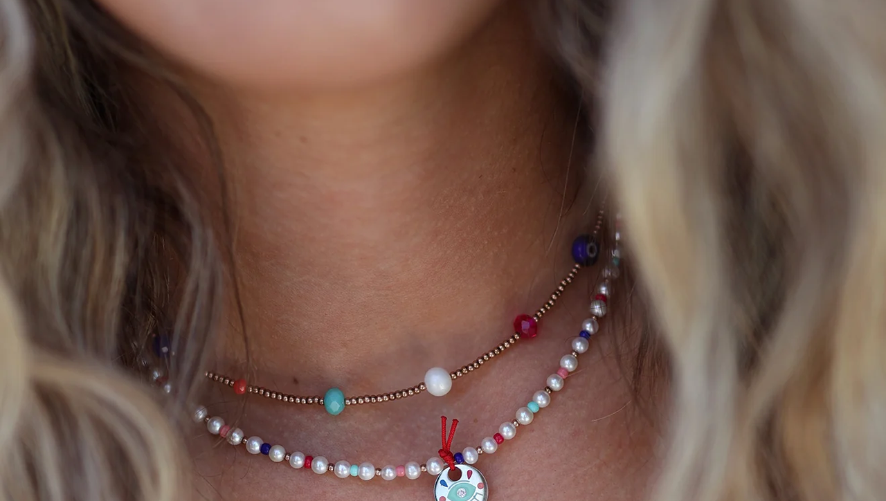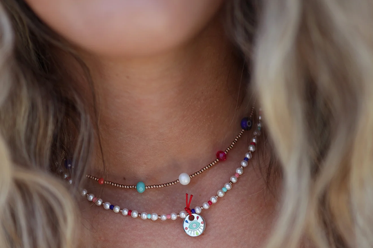 - Ova šarena ogrlica s perlicama, riječnim biserom i posrebrenim privjeskom unosi savršen miks boho i ljetne estetike