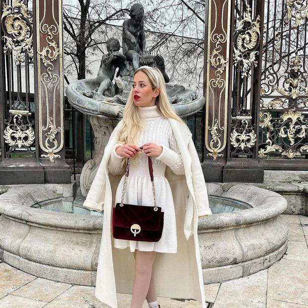 Vitka plavuša odlučila se za gležnjače visokih potpetica koje idu u špic, a kombinirala ih je s bijelom motorističkom kožnom jaknom. Bijela je tako izvrsno komplementirala zemljanim smeđim tonovima u kojoj su bile hlače s vezicom u struku, a na koje se odlučila obući dolčevitu s čipkastim detaljem u 'ubojitoj' bordo boji.