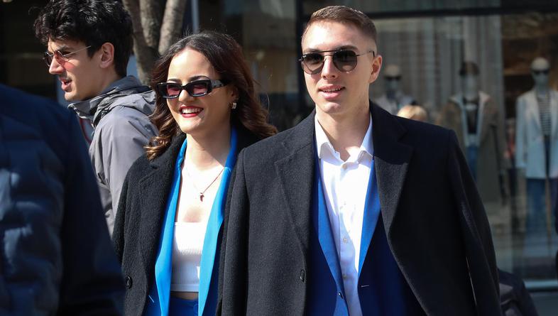 Ni muški dio ovog skockanog para nije propustio modno briljirati. Mladić je nosio kombinaciju s istom paletom boja – crna, bijela i plava. Klasični komadi poput plavih traperica, bijele košulje i crnog kaputa savršeno su se nadopunili s trendi komadima poput sakoa u jarko plavoj boji i bijelih Alexander McQueen tenisica s plavim detaljem.