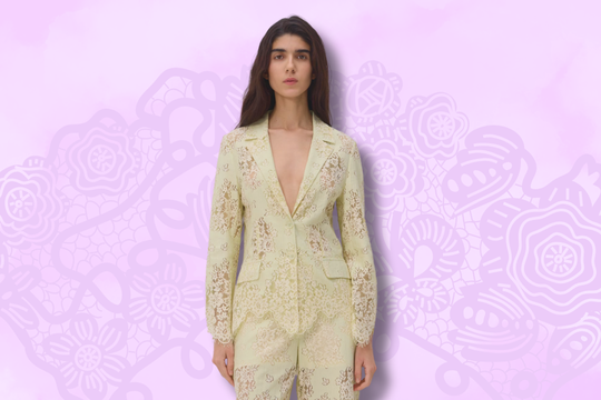 Naime, radi se o kompletu sakoa i hlača u pastelno žutoj boji koji je izrađen od nježne, romantične čipke s cvjetnim motivima. Romantičnosti i prozračnosti ovog odijela, koja će nam i trebati u narednom razdoblju, pridonosi to što su čipkasti dijelovi prozirni pa se ispod njih suptilno i nimalo provokativno, nazire koža. Odijelo je zaista savršena ravnoteža elegancije i odvažnosti.