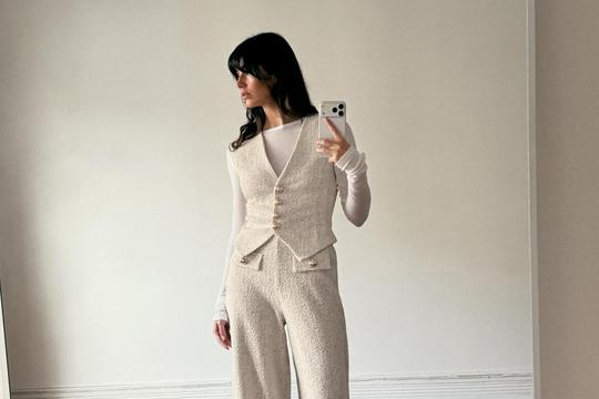Zara hlače od strukturirane tkanine dolaze sa srednje visokim strukom i unutarnjom elastičnom pasicom, što ih čini udobnima, ali i vizualno vrlo urednima. Lažni prednji džepovi sa zlatnim metalnim gumbima te metalizirane niti u tkanini daju im suptilan luksuzni touch, dok široke nogavice izdužuju siluetu. Dostupne su u sivoj (crna/bijela kombinacija) i bež (ekru) varijanti. Oba neutralna tona se lako uklapaju u zimski ormar.